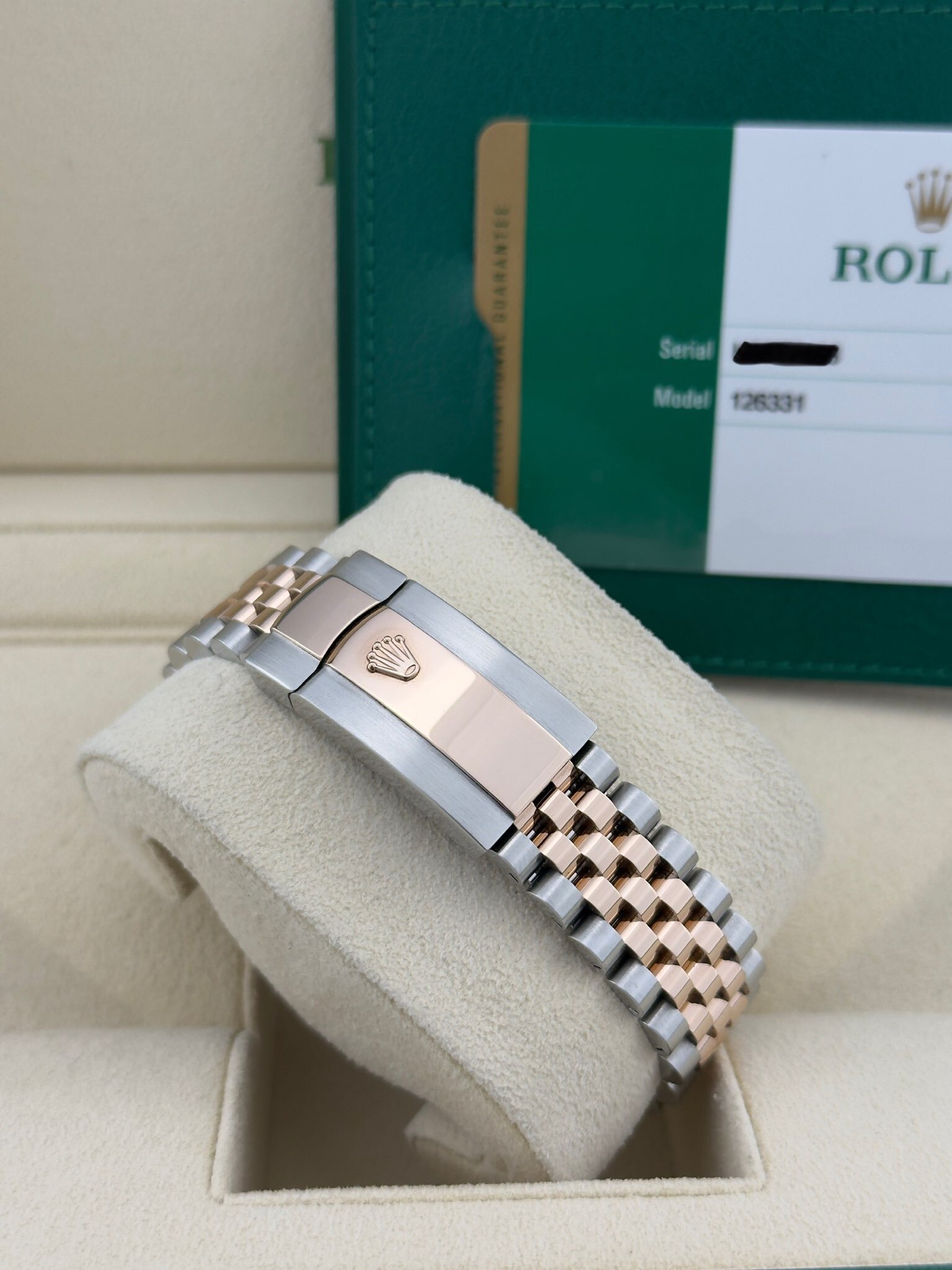 Bracelet Style: Jubilee, 18k Rose Gold High Polish Center Links with Brushed Finished Stainless Steel Outer Links